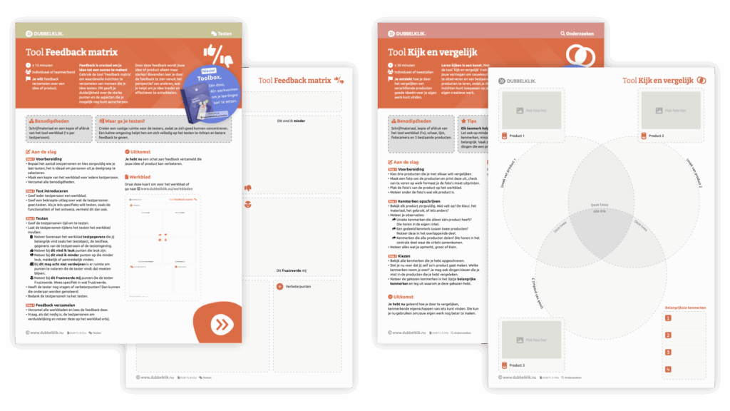 Deze tools helpen bij het verzamelen van informatie en het analyseren van bestaande producten, gebruikers of situaties. Ze stimuleren leerlingen om met een open en kritische blik de wereld om zich heen te verkennen.