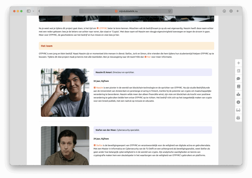 Tijdens het doe-project Crypto gaan leerlingen aan de slag bij het fictieve crypto-bedrijf OTPYRC – een jonge, idealistische startup onder leiding van directeur Nassim. (OTPYRC? Lees het eens van achter naar voren.) OTPYRC gelooft dat blockchain-technologie de wereld eerlijker en transparanter kan maken. Vanuit die missie schakelt het bedrijf leerlingen in om mee te bouwen aan een nieuwe cryptomunt die niet alleen innovatief is, maar ook bijdraagt aan een beter morgen.