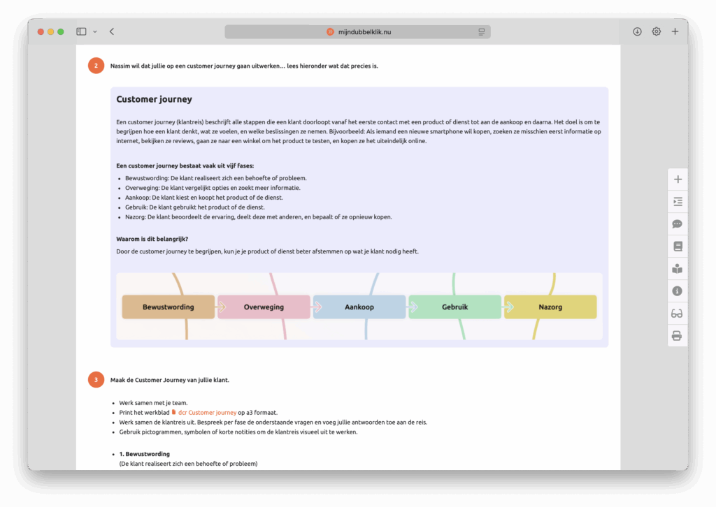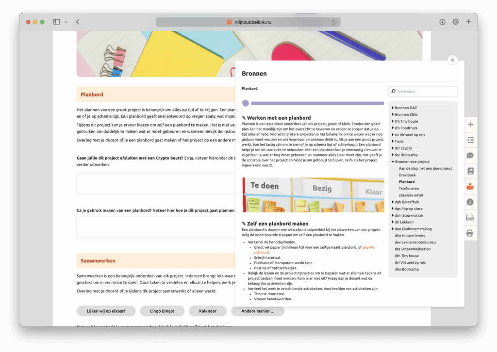 Dit doe-project is volledig verwerkt in het mijndubbelklik.nu digitale leerportaal, inclusief alles wat je als leerling én docent nodig hebt. De lessen zijn visueel, eigentijds en activerend, met een afwisselende mix van vragen, praktijkopdrachten en kennis. Leerlingen hebben altijd toegang tot alle informatie via het bronnenboek – overzichtelijk en on-demand. Voor docenten is er een uitgebreid leerlingvolgsysteem, een complete docentenhandleiding en de mogelijkheid om digitaal werk na te kijken en te beoordelen. Zo wordt begeleiden overzichtelijk en efficiënt.