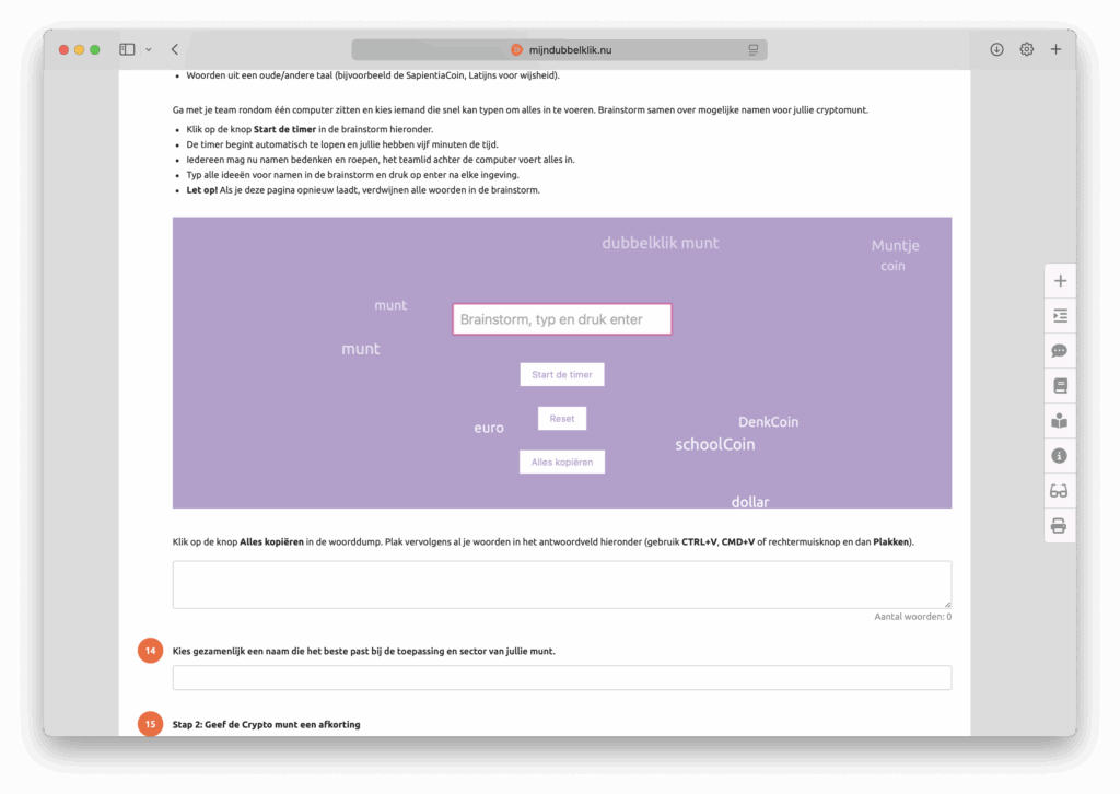Elk team ontwerpt een nieuwe cryptomunt die een écht probleem oplost. Bijvoorbeeld een munt die jongeren beloont voor vrijwilligerswerk, of een munt die eerlijke handel stimuleert. Leerlingen denken na over een toepassingsgebied (zoals zorg, duurzaamheid of onderwijs), een doelgroep en hoe blockchaintechnologie daar een verschil kan maken. Ze geven hun munt een naam, afkorting, symbool en kleurenschema – alles wat je nodig hebt voor een sterk merk.